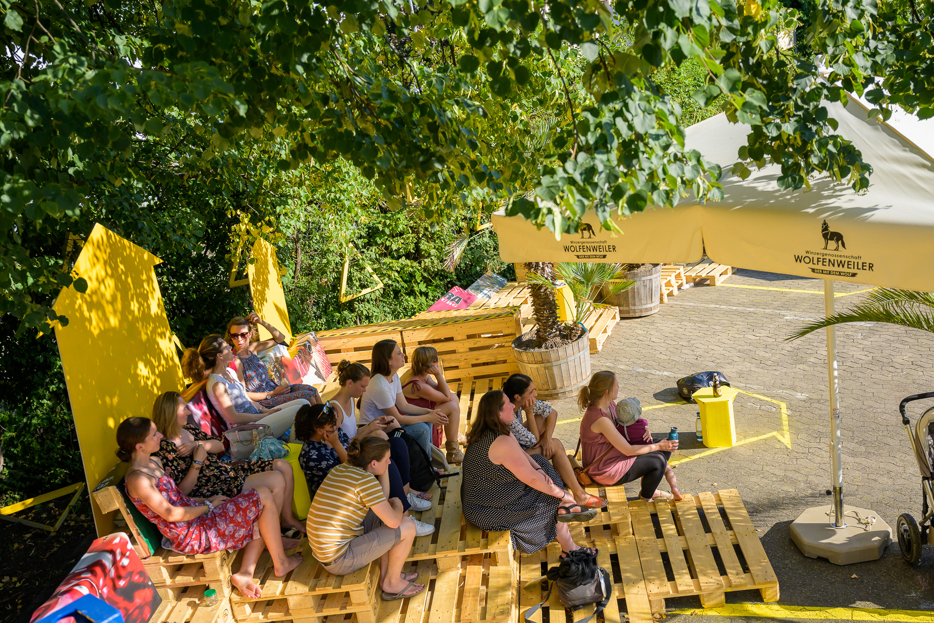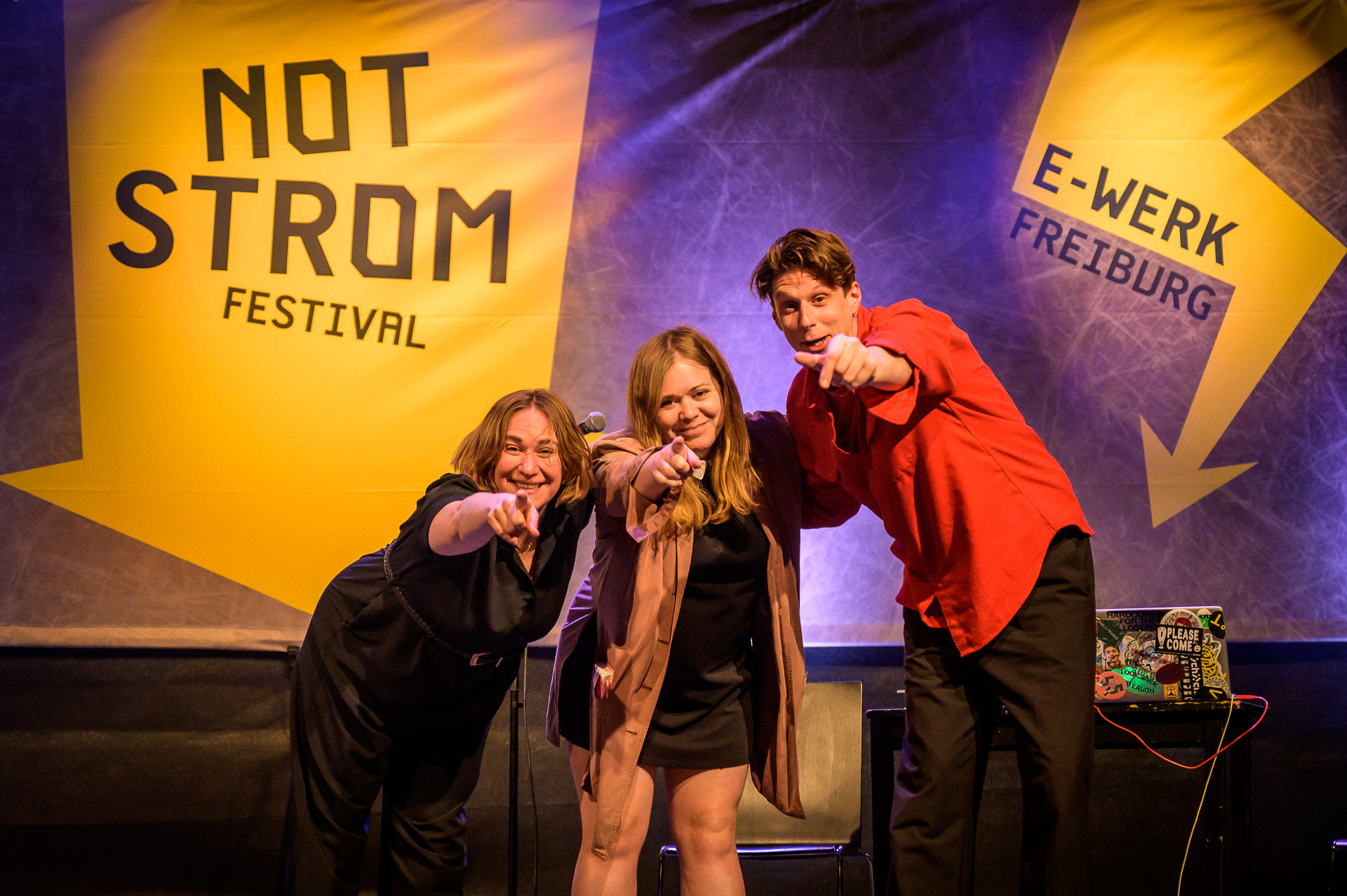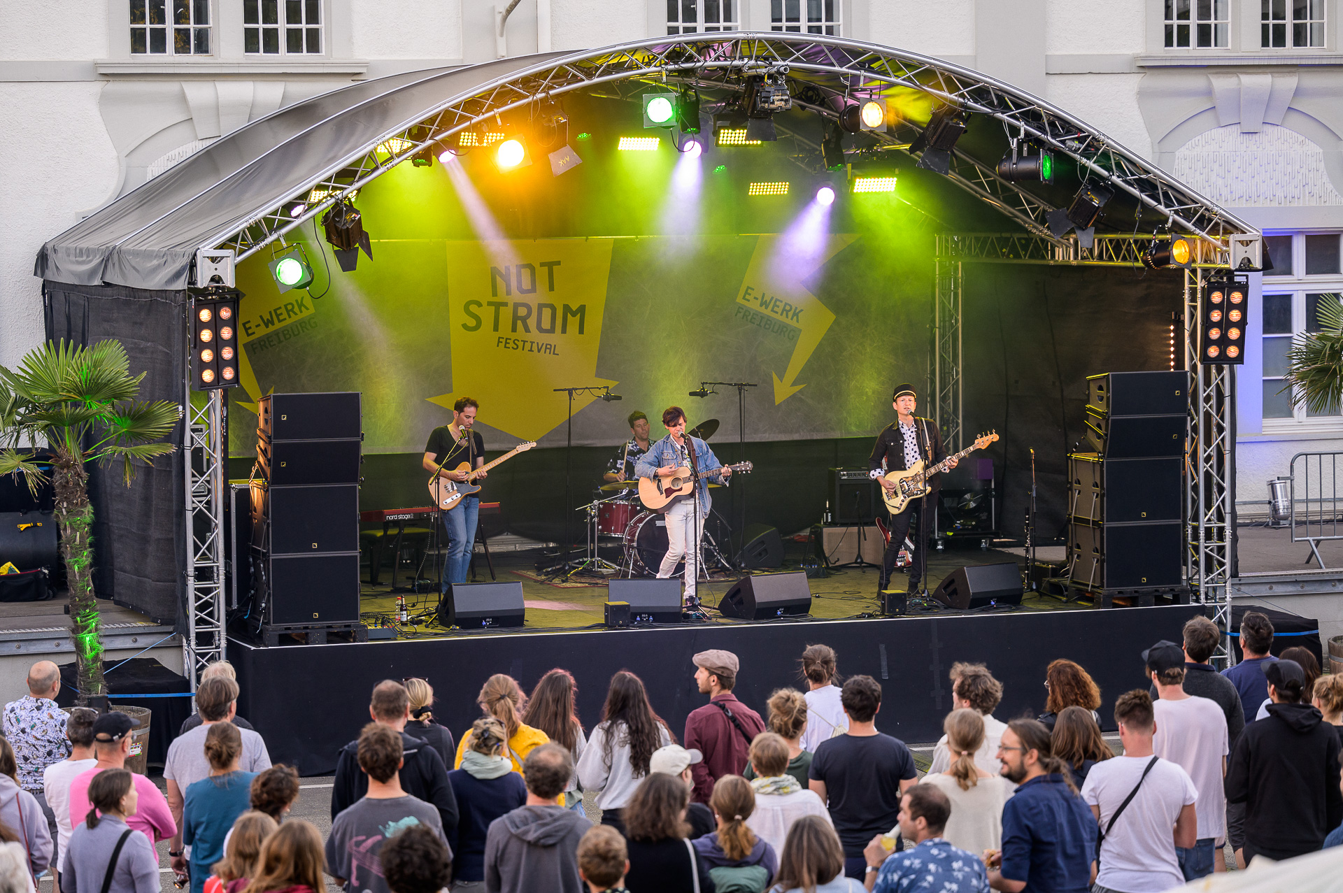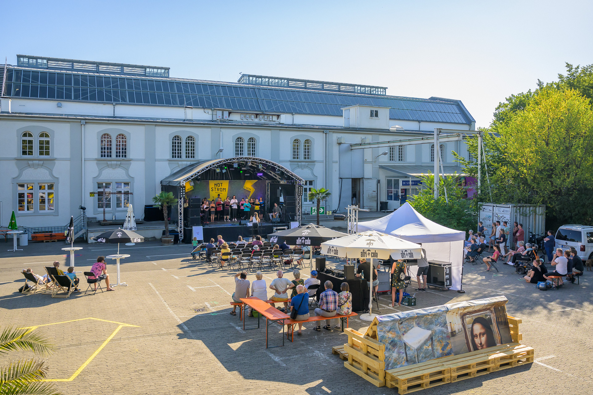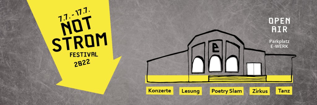 „Kunst statt Autos“: Das E-WERK schafft für das NOTSTROM-FESTIVAL auf seinem Parkplatz ein schlichtes, aber durch seine Lage und sein Ambiente bestechendes Festivalgelände für bis zu 500 Zuschauer*innen. Auf dem Parkplatz entsteht so ein Kunstraum, der es ermöglicht, Kunst und Aktionen in allen Sparten und vielen Spielrichtungen zu zeigen. Ein temporärer Biergarten wird zum Treffpunkt und Austauschort der Kulturszene.