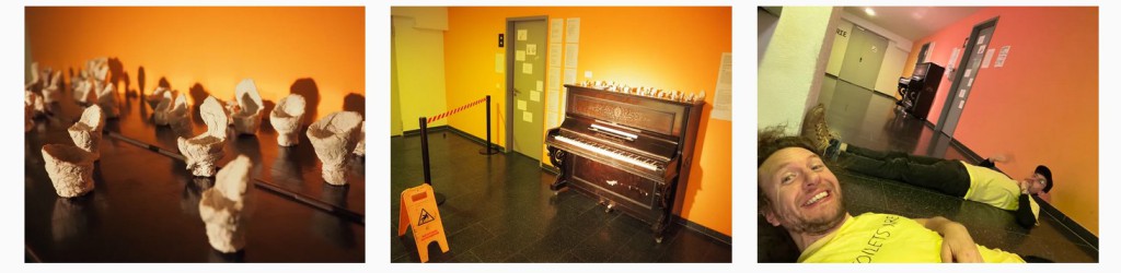 The Klokunstgalerien are not a new space physically, but rather ideologically. They are a re-imagining of an existing non-artistic space i.e. the toilets and surrounding corridors in the basement of E-WERK Freiburg. There are three new gallery spaces: gallery A is the open corridor space, gallery B is the former mens toilet and gallery C is the former women’s toilet. It is crucial to note that gallery B and C, whilst being artistic spaces, remain functionally as toilets to be used by visitors to E-WERK. All art that takes place in the Klokunstgalerien thus needs to respect the necessary function of the toilets and question how it intersects this requirement.